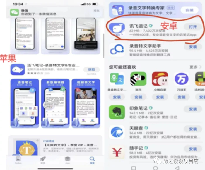 ① 应用商城下载一个讯飞语记APP,这是操作项目的工具。