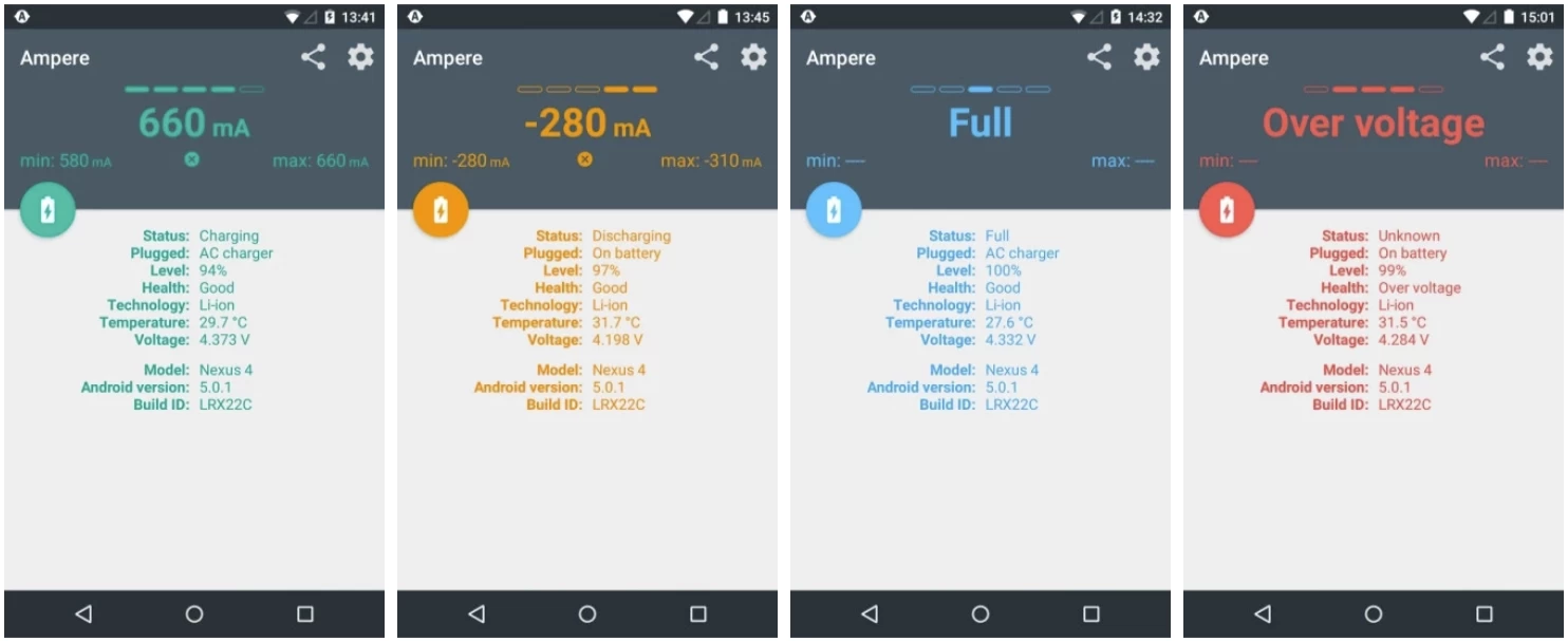 ampere 充电评测 一款非常不错的专业电池管理软件,很多朋友在充电的时候喜欢观看电池的充电进度,这款软件则很好的实现了这个功能。除此之外,软件还可以检查电池的状态信息,支持安卓手机设备充电测试。支持电池警报设置,可以设置电池提醒设置,比如当电池充满、电池电量不足时提醒你。温度过高提醒,保证手机的温度不过高,及时拔掉电源。设置通知优先级,最高、较高、默认、较低等。