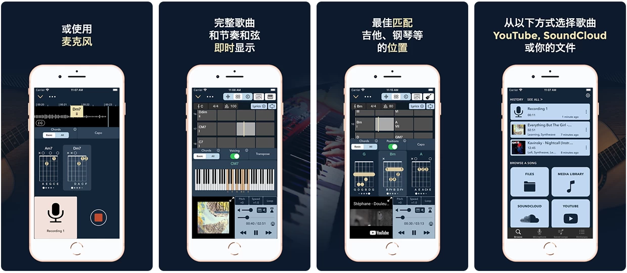 Chord ai 可以从您的设备、任何视频 / 音频流媒体服务或您周围的现场播放的音乐中收听音乐,并立即检测和弦,然后它会告诉你用吉他、钢琴或尤克里里琴弹奏这首歌的手指位置。