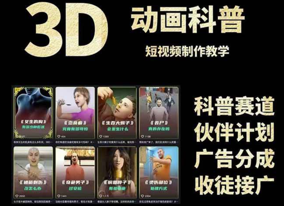 该资源为22万粉丝博主出品的3D动画科普短视频教学课程,包含文案、等热门科普内容创作教学,提供从素材查找、翻译拼接、配音剪辑到封面设计的全流程指导,附带PSD模板、素材包及对标账号参考,适合参与抖音伙伴计划、分成计划及接广告变现。