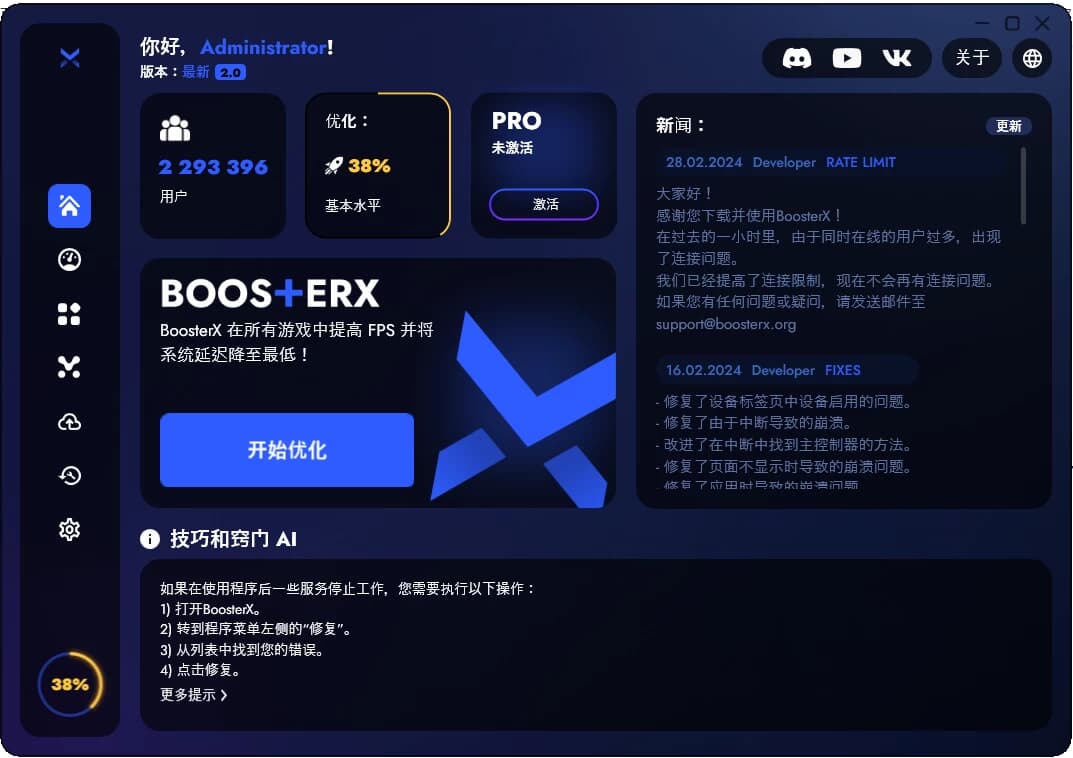 BoosterX 是一款系统优化工具,能够帮助用户从多个方面对电脑的系统进行深度的优化,帮助用户降低系统的延迟,提升游戏的fps,让游戏的玩家能够获取更好的体验。