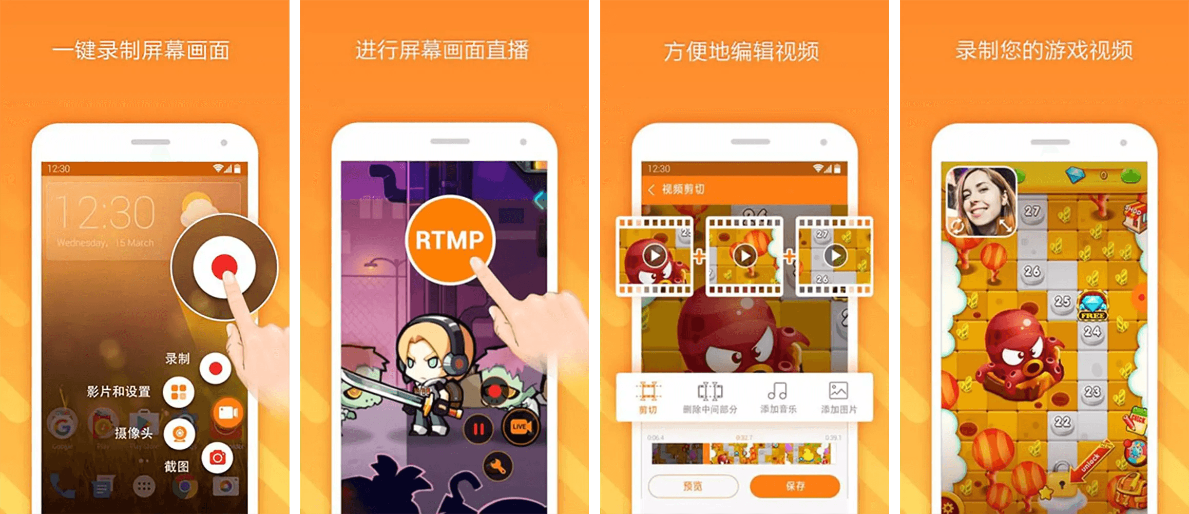 除了录屏功能外,还支持截屏、图片编辑、屏幕录制、屏幕直播、视频编辑等功能,让用户可以轻松的制作游戏视频、操作视频,来电视频、影视剧片段等功能,而且还支持多种高清的录频格式,如1080P、12Mbps、60FPS的最高质量视频录制,绝对库满足您的日常所需。